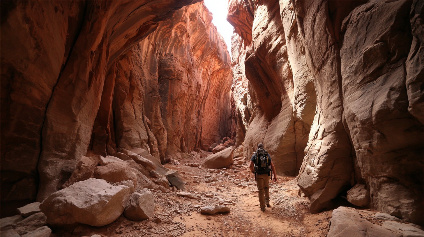 Hiker with a backpack walking through a narrow red rock slot canyon